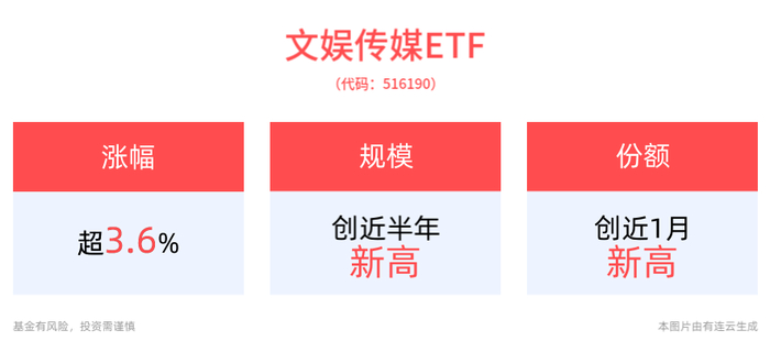 份额方面,文娱传媒ETF最新份额达2721.85万份,创近1月新高。