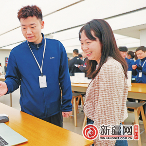 12月4日,在华为智能生活馆(时代广场店) ,工作人员向消费者讲解笔记本以旧换新优惠补贴活动。(全媒体记者迪丽娜尔·加力肯摄)