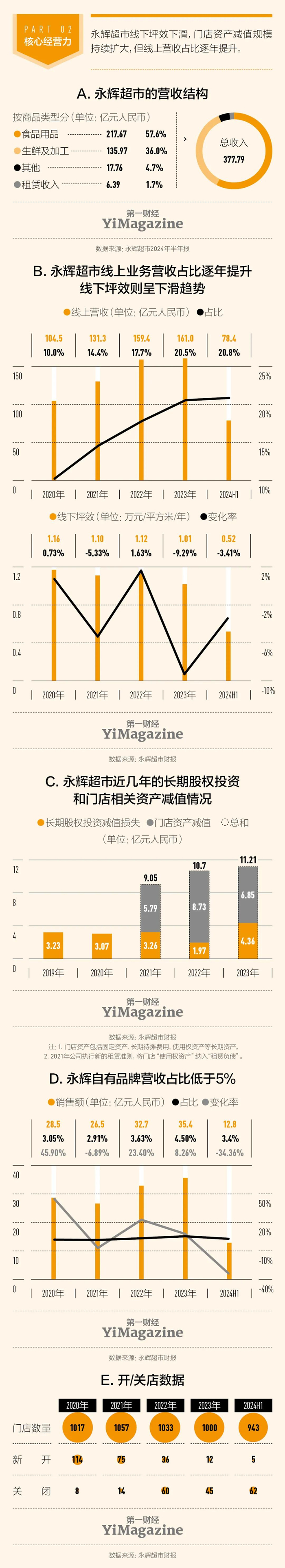 值得注意的是,永辉超市的综合毛利率一直稳定保持在20%上下。毛利率水平似乎是永辉衡量经营健康度最重要的一根指挥棒。但与此同时,永辉的门店经营效率在下滑——2019年之前,其库存周转率一直都保持在8次以上,但2023年降至6.6次。同时永辉的门店坪效(计算公式为营收÷经营面积)也呈下降趋势。这些数据均反映出尾部低效门店对永辉整体毛利率水平的拖累。