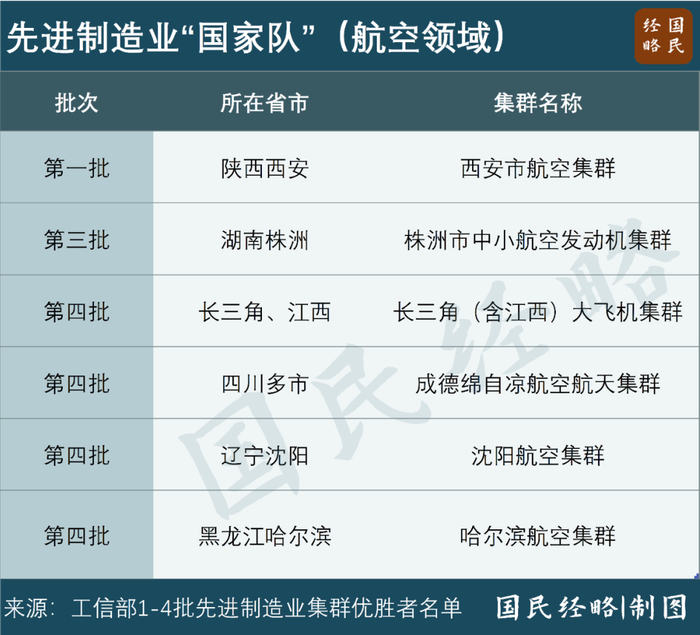 航空制造属于先进制造业。工信部先后发布四批先进制造业集群“国家队”名单,共有80个集群入围,只有6个与航空产业相关。