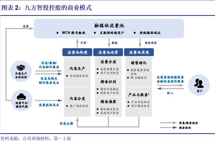 九方智投控股通过专业化的投研团队,针对市场散户投资者的兴趣生产效应的投研内容,并通过流量分发精准推送的形式,吸引投资者观看公司的内容,并完成客户服务于销售转换,具体的变现方式包括