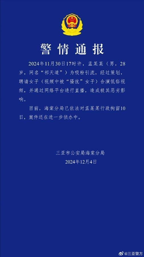 目前,海棠分局经调查,确认其视频为剧本摆拍,已依法对孟某某行政拘留10日,案件还在进一步侦办中。(据12月5日扬子晚报)