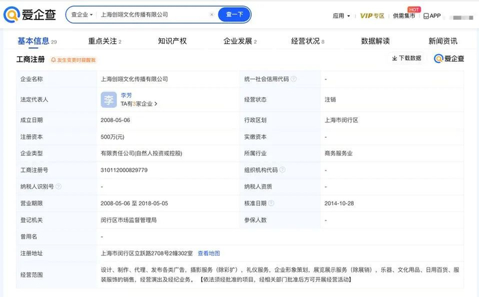 爱企查App显示,上海创翊文化传播有限公司成立于2008年5月,法定代表人为李芳,注册资本500万元人民币,经营范围包括经营演出及经纪业务、礼仪服务、企业形象策划等,由李芳、胡赛群共同持股,于2014年10月注销,注销原因为决议解散。分支机构信息显示,该公司设立1家分支机构,具体为上海创翊文化传播有限公司北京广告分公司,已于2016年2月注销,注销原因为经营期限届满。