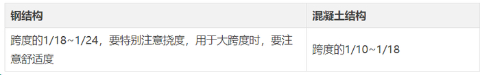 混凝土梁高跨比的最小值1/18是钢结构高跨比的最大值。在常规设计中,钢梁的高跨比通常取1/20。对于轻型屋面的钢梁,这个比值可以降低到1/30,但一般不小于1/40。