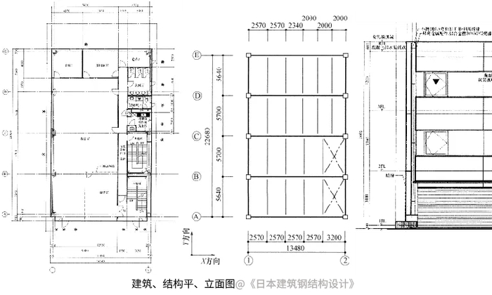 以《日本建筑钢结构设计》中的一个例子为例,这是日本较为常见的情况:一栋三层钢结构办公楼,为了实现更灵活的建筑平面功能分割,采用了无柱的室内空间,即单榀钢框架结构体系。这种设计使梁跨度达到13.5米,采用H型实腹钢梁配合冷弯矩形钢管柱,实现起来相对容易。钢结构建筑因此能提供更开阔的空间和更自由的功能布局。