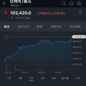 12月5日上午,比特币正式突破10万美元/枚,截至发稿,比特币报10.34万美元/枚,日内上涨7.81%,创历史新高,总市值超2万亿美元。拉长时间来看,年内比特币涨幅近140%。11月4日以来,比特币直接从6.8万美元上涨至10万美元,仅用时一个月。