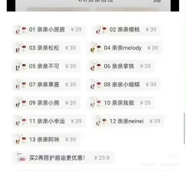 另外,花洛莉亚的另一款“亲亲唇泥”产品也因命名引发争议,其色号名称为“亲亲阿咪”“亲亲小居居”“亲亲neinei”亦引发了网友的不满。