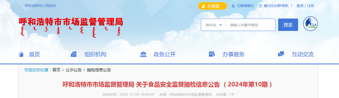 内蒙古呼和浩特市市场监督管理局关于食品安全监督抽检信息公告 (2024年第10期)