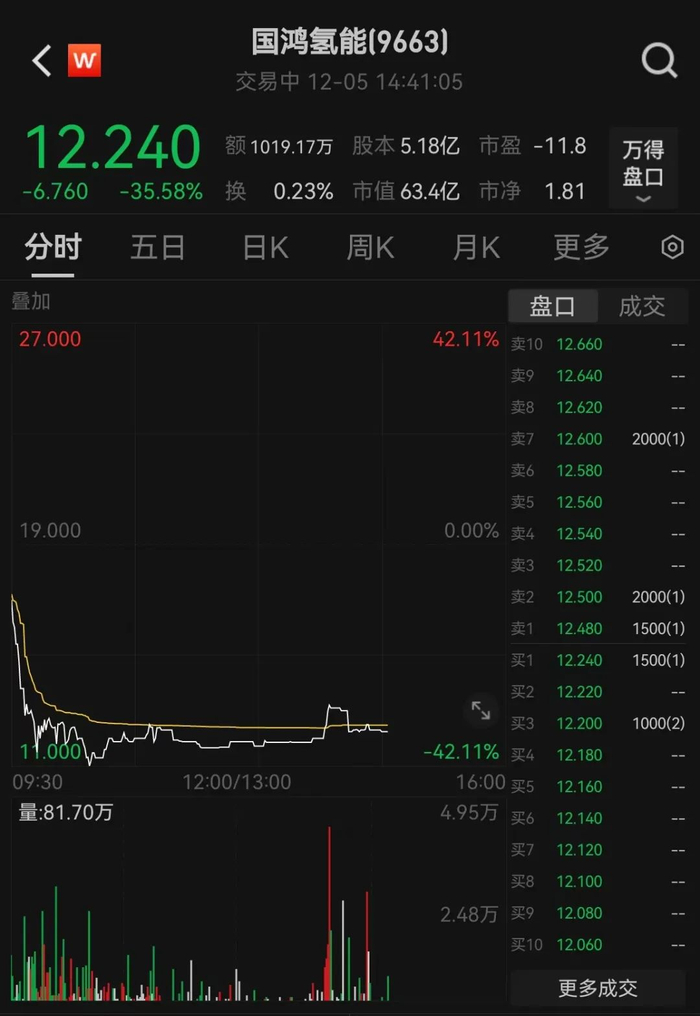 12月5日开盘,国鸿氢能盘中一度大跌逾40%。截至发稿,该只股票报12.24港元/股,跌幅仍超35%,最新市值为63.4亿港元。