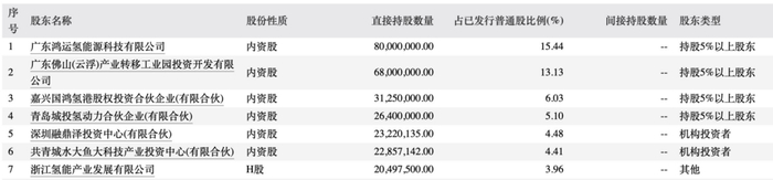 根据最新股东信息,国鸿氢能的主要股东包括广东鸿运氢能源科技有限公司、青岛城投氢动力合伙企业(有限合伙)等,其中第一大股东广东鸿运氢能源科技有限公司持股比例为15.44%。