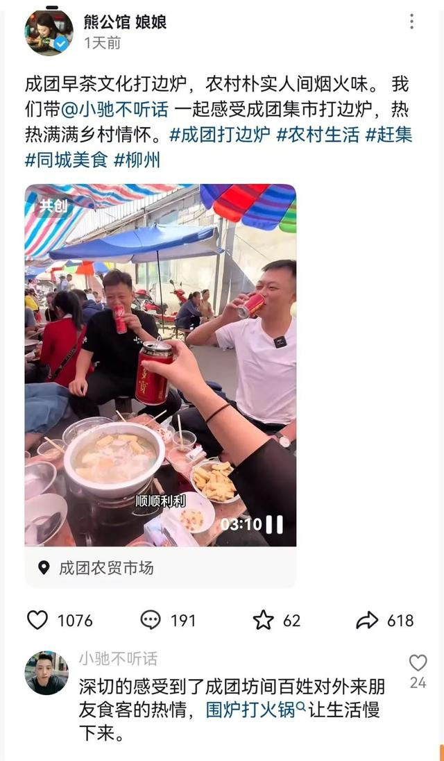 说到成团特色,从集市的“打边炉”,到周边的成团会议旧址、朝阳渡槽、北弓水库、卜村屯手工编织扇、黄毛屯棉胎、舟村、鲁比葡萄、黑皮甘蔗等,韦宝玲都如数家珍。工作之余,她几乎走遍了成团镇周边的每一个特色村屯,并且拍摄制作视频,在社交平台跟网友们分享。在她的视频里,有编织手工扇的老人,有骑三轮车去村屯游街卖猪肉的摊贩,有在早市“打边炉”时推杯换盏的老乡们……“我分享的都是家乡人家乡事,很接地气,也很温暖。”韦宝玲说,朋友们看到她发的视频后,也来到当地体验;后来,“小驰不听话”“螺美丽”等本地一些网络博主们也过去拍视频,并分享在自媒体平台。11月14日,今报记者前往当地采访报道,随后其他各主流媒体也纷纷跟进报道。