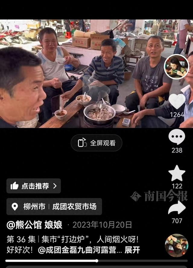 记者追溯发现,早在2022年,一个名为“熊公馆娘娘”的自媒体账号,就开始在社交平台分享成团“打边炉”视频;2023年、2024年,该账号也有相关内容的分享;就在近期“打边炉”爆火前后,该账号更是发布多条小视频分享了相关内容。除此之外,记者还发现该账号分享的视频内容大多是关于柳江民俗民风的。“熊公馆娘娘”这个账号的背后,就是韦宝玲——一个地地道道的成团人。
