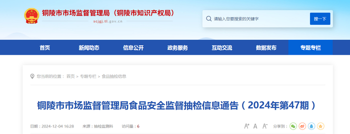 安徽省铜陵市市场监督管理局食品安全监督抽检信息通告(2024年第47期)