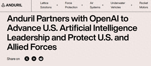 Anduril Industries联合创始人兼首席执行官Brian Schimpf表示,“Anduril打造的国防解决方案可满足美国及其盟军的紧急作战需求。与OpenAI的合作将使我们能够利用他们在人工智能领域的世界级专业知识,来解决全球紧张的防空能力缺口。我们共同致力于开发负责任的解决方案,使军事和情报人员能够在高压情况下做出更快、更准确的决策。”
