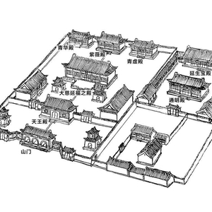 中路的最后一进建筑,是三间并列的殿堂,居中的是紫微殿,东侧为青虚殿,西侧为青华殿。这种殿堂的分布结构源自于汉魏时期的“东西堂”制度。