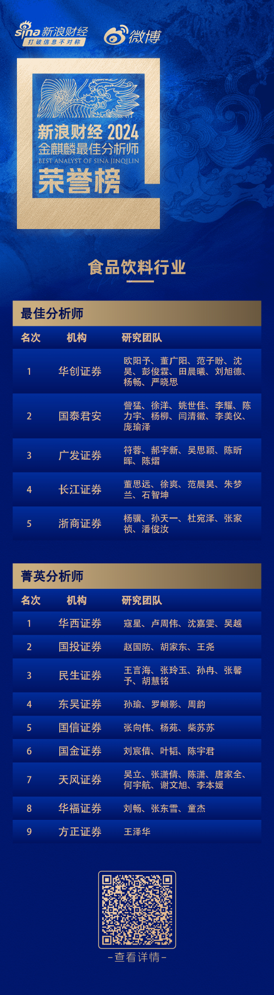 第六届新浪财经金麒麟食品饮料行业最佳分析师:第一名华创证券欧阳予研究团队