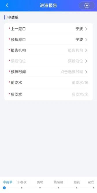 3.进港/出港报告填报时,请根据页面底部提醒,按船舶实际情况依次完成“申请单—车客驳—货物—集装箱—船员”信息的填写,填写完毕后在完成页核对填报情况,确认无误后点击提交。