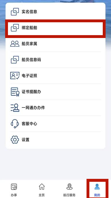 1.打开“海事通”APP在底部选择“我的”栏,法人账号点击“我的船队”(下左图),个人账号点击“绑定船舶”(下右图),即可进入绑定船舶界面。