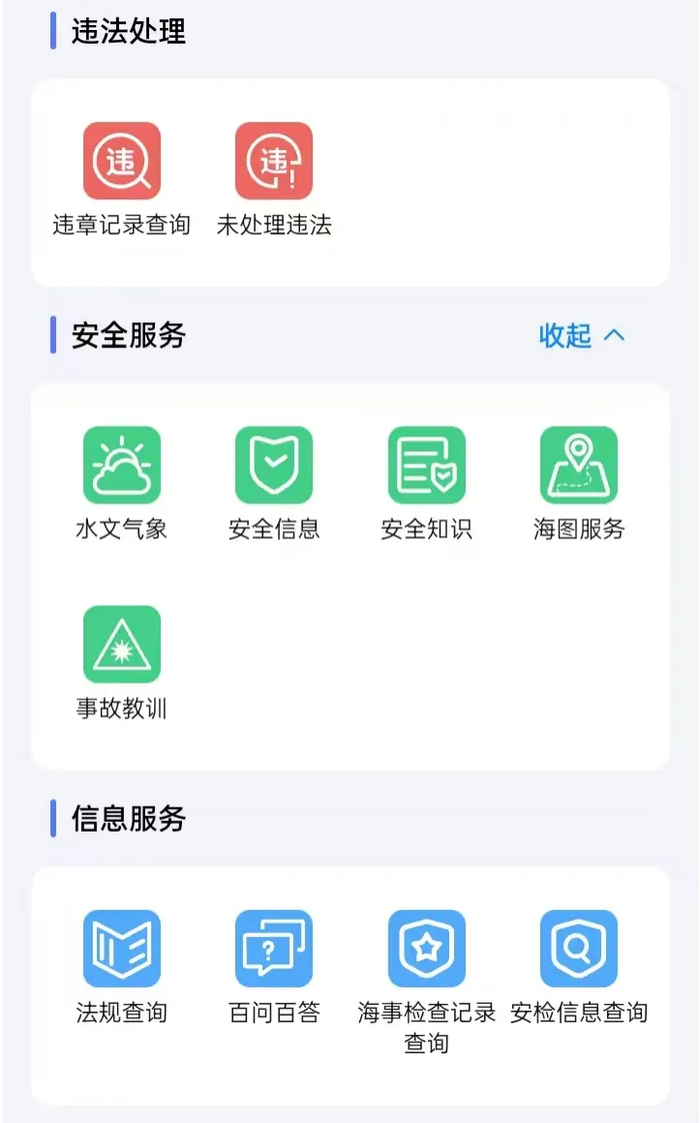 提供违章记录查询、水文气象、海图服务、法规查询、案件查询等信息的查询服务。
