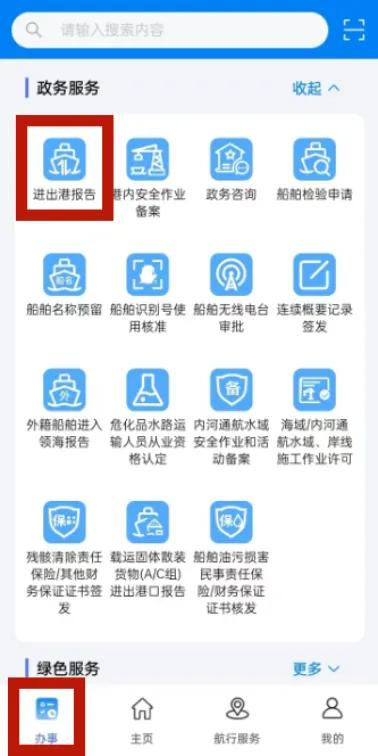 1.登陆后进入“海事通”APP主界面,在最下方选择“办事”栏。在“政务服务”栏选择“进出港报告”,即可进入“船舶进出港报告系统”。