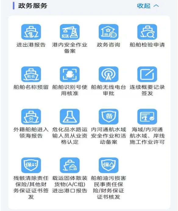 提供进出港报告、港内安全作业备案、政务咨询、船舶检验申请、船舶名称预留等事项的线上办理服务。
