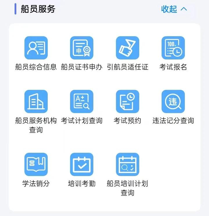 提供船员综合信息、船员证书申办、违法记分查询等事项的申报及信息查询服务。