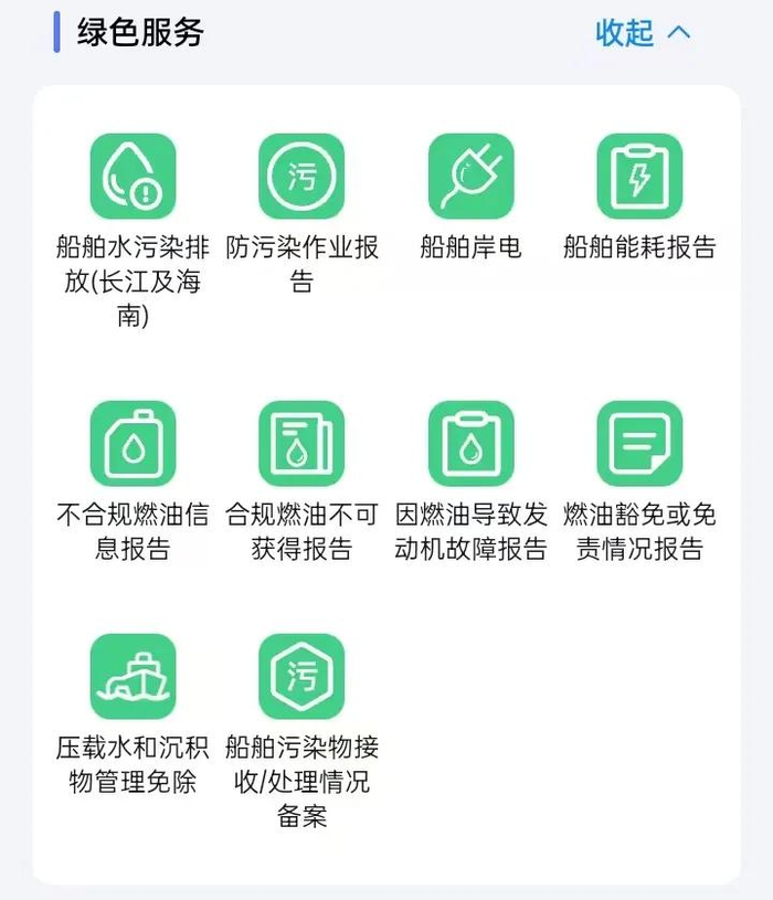 提供防污染作业报告、船舶能耗报告、船舶污染物接受/处理情况备案等事项的线上办理服务。