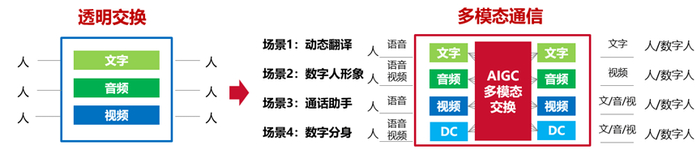 进入2023年,随着AI技术兴起,我们重新审视和调整了战略方向。当时我负责的一个命题是:AI能给新通话带来什么?那天,我坐在电脑前思考了整整一天,到了晚上,突然想起领导之前提到的一个关键信息——多模态。在传统通话中,信息传输是透明的,即对方发什么我们看什么,但AI的引入使得我们可以进行不同模态的转换和融合,可以将声音转换成视频,也可以生成数字人展现说话者的形态,甚至未来可能实现人与机器之间的语言转换,打破沟通界限。于是我绘制出一张图,展示了AI如何赋能通信,实现话音业务的多模态交换,并提出了“多模态通信”这一概念。