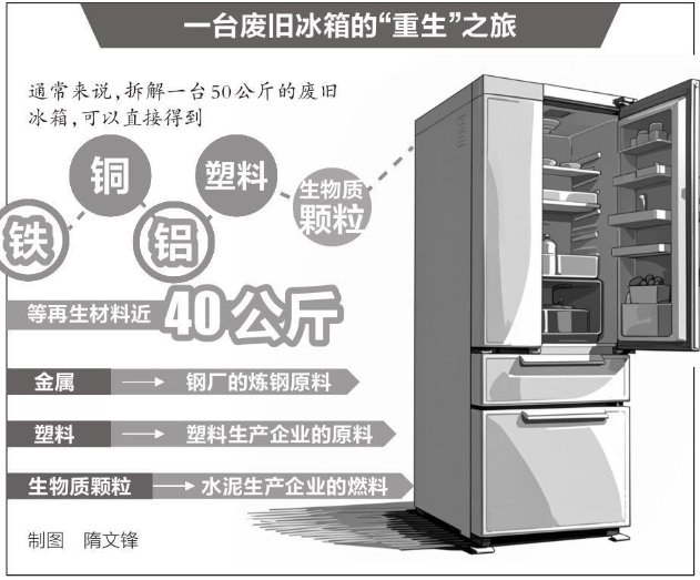 这样的变化,循环利用基地运营方感受很深。“我们去年拆解废旧冰箱32万台,今年保守估计可超过50万台。”周杉说,“未来将把新能源电池等资源化利用内容纳入进来,打造‘城市矿产’循环基地。”