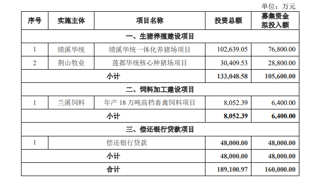 《财中社》注意到,此次定增,华统股份计划募资16亿元,用于生猪养殖、饲料加工和偿还银行贷款等。其中,偿还银行贷款的规模为4.8亿元。