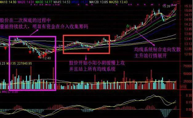 (3)移动平均线在底部区域波动时,往往会在底部反复纠缠。