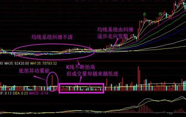 这是后市行情还不明朗的信号。当短期均线率先上涨,中期均线和长期均线也先后向同一方向运行时,异动平均线逐渐成多头排列的形状。这是上涨行情出现,主升浪即将展开的信号。