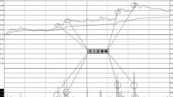(4)在分时走势中,盘中出现典型的攻击式量峰。在出现持续攻击时,量峰波形特征明显。