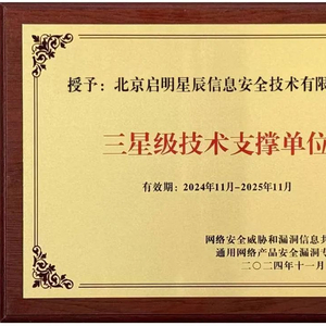 近日,2024年(第十三届)电信和互联网行业网络安全年会在北京成功召开,会上正式举行了工业和信息化部网络安全威胁和漏洞信息共享平台(NVDB)通用网络产品安全漏洞专业库2024-2025年度技术支撑单位授牌仪式,启明星辰凭借在支撑工业和信息化部网络产品安全漏洞治理、应急响应等方面的突出表现与杰出贡献,荣获最高等级“三星级技术支撑单位”称号。