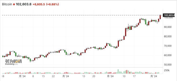 12月5日10时许,比特币升破10万美元,截至12时30分报102603美元,24小时内涨幅达6.88%。今年以来,比特币已经累计上涨143.83%。近一个月比特币进入“疯牛”行情,直接从6.8万美元上涨至10万美元。