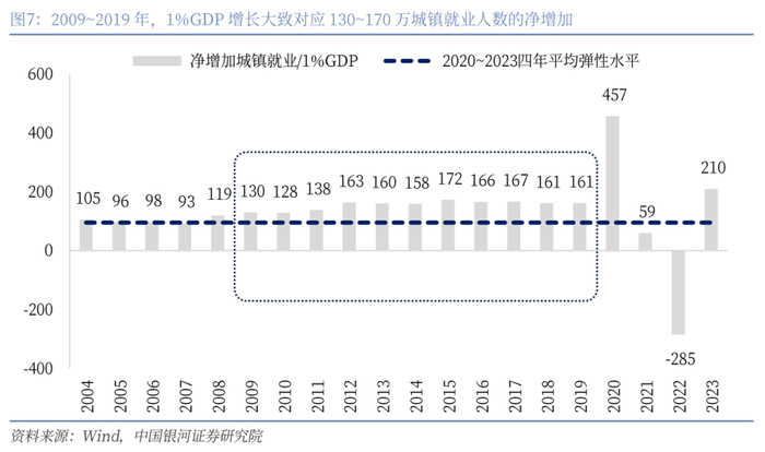 从弹性系数的角度出发去验证,我们发现从2009年开始直至2019年,每1%的GDP增长可以稳定的带来约130~170万城镇就业人员的净增长。