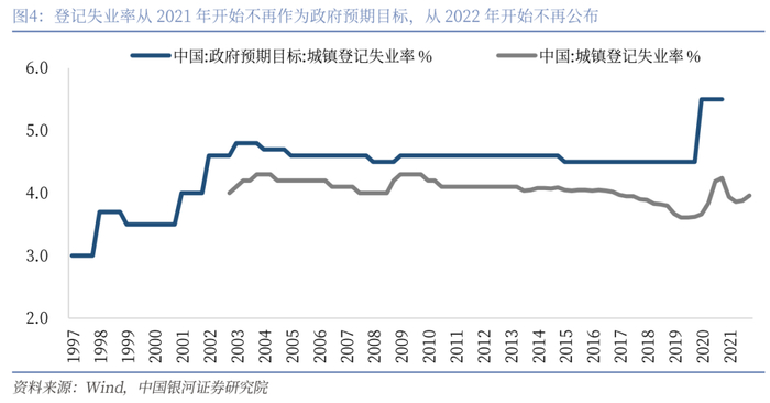 首先,我们发现,实际上在十四五规划当中,充分就业的相关预期目标已经改为“保持城镇调查失业率在5.5%以内”,城镇新增就业人数的目标自九五规划(1996-2000)以来首次缺席。从如此高级别的政策文件中,我们已经可以看出城镇新增就业人数可能逐渐会退出历史舞台,亦如当年的“城镇登记失业率”。
