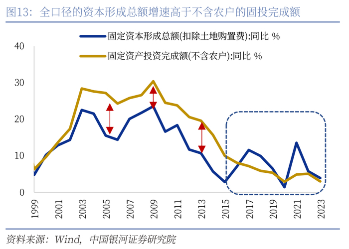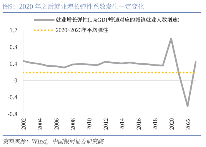 · 2020年之后,城镇就业人数与GDP增长的关系也出现了一些变化。从2002~2019年的十八年间,就业增长弹性(1%GDP增速对应的城镇就业人数增速)基本稳定在0.4倍,但2020年~2023年的平均弹性下降至0.2倍,也就是说,GDP增速对应的城镇就业人数增长有所放缓,换言之,单位城镇就业人数的增加对于GDP增速的拉动作用更加显著。我们认为原因有二:其一,2020年之后,第二产业增长表现较好,但二产中更多是资本密集度行业,人均产值更高,带动就业的能力不如第三产业。其二,我们一直着眼于城镇就业增长和经济增长的相关性,但疫情之后,农村经济相较城镇而言表现更有韧性,为GDP增长贡献了更多力量,也可能使得GDP与城镇就业增长的关系发生了一定变化