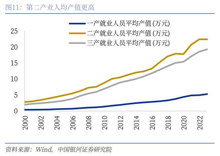 我们找到了两点原因。其一,2020年之后,第二产业增长表现较好,尤其是制造业占比基本保持稳定,但第二产业中更多是资本密集度行业,人均产值更高,带动就业的能力不如第三产业,这可能导致了2020年之后的GDP增长与就业增长之间的关系有所弱化。