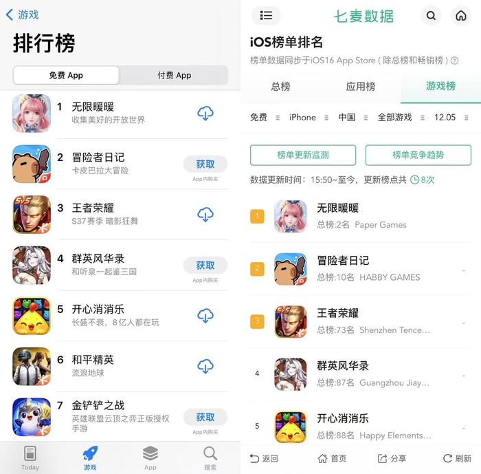 据悉,《无限暖暖》在上线前的全球预约人数已超3000万。开启预下载6小时内,登顶全球34个国家和地区免费榜,108个国家和地区游戏分类Top1。截至发稿,该游戏位于iOS免费游戏榜首位。