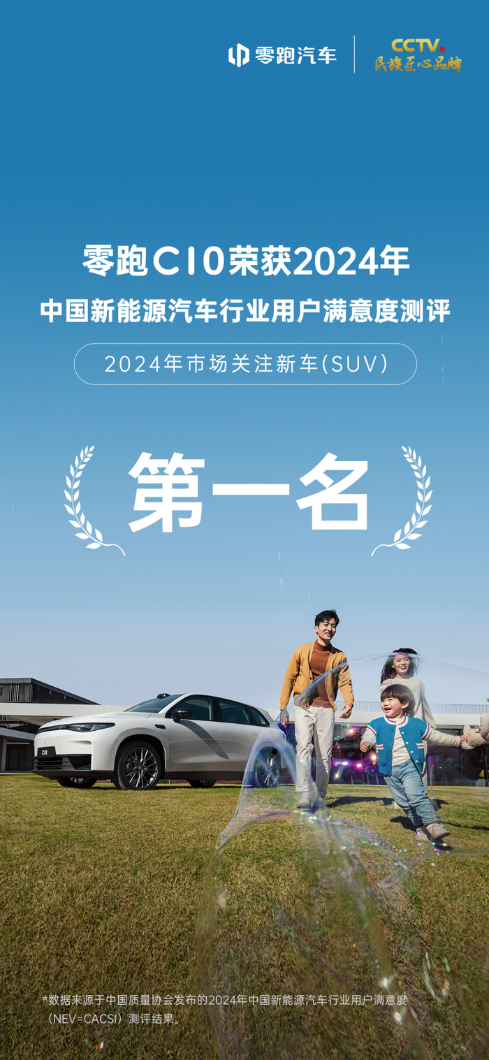 12月4日,中国质量协会发布2024年中国新能源汽车行业用户满意度测评(NEV-CACSI)结果,零跑C10获2024年市场关注新车(SUV) 满意度第一名。