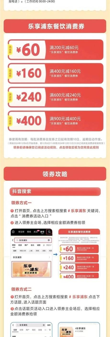 抖音平台的领券方式为:消费者通过抖音APP搜索“乐享浦东”进入活动页面。
