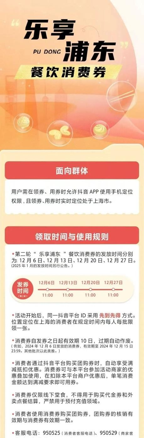 为贯彻落实国家和上海促进服务消费相关部署,活跃餐饮堂食,增加消费人气,浦东新区决定发放“乐享浦东”餐饮消费券。现将第二轮餐饮消费券相关事宜公告如下: