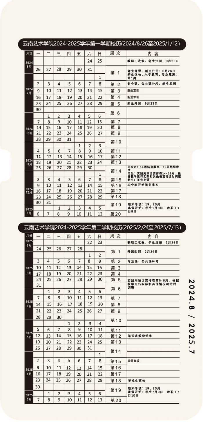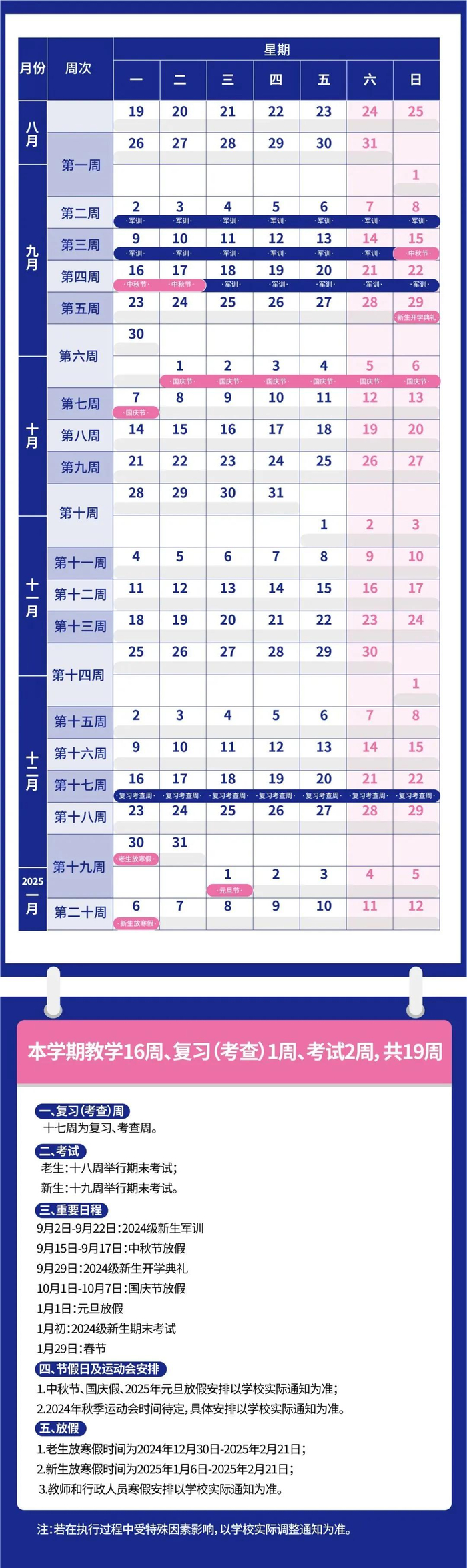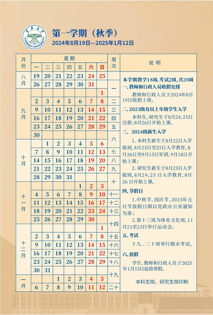 第一学期放假时间:不迟于2025年1月19日。(教学时间为20周,含复习、考试时间)