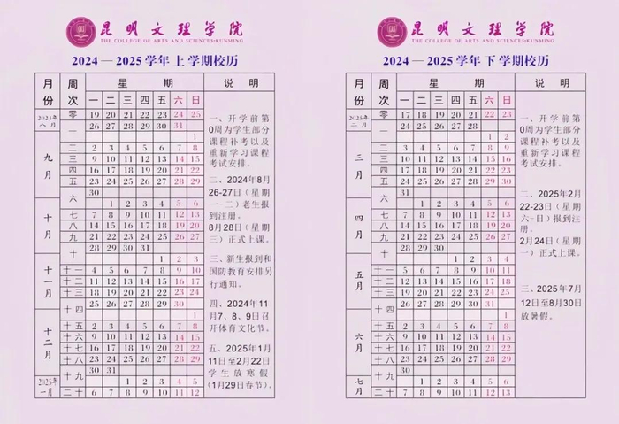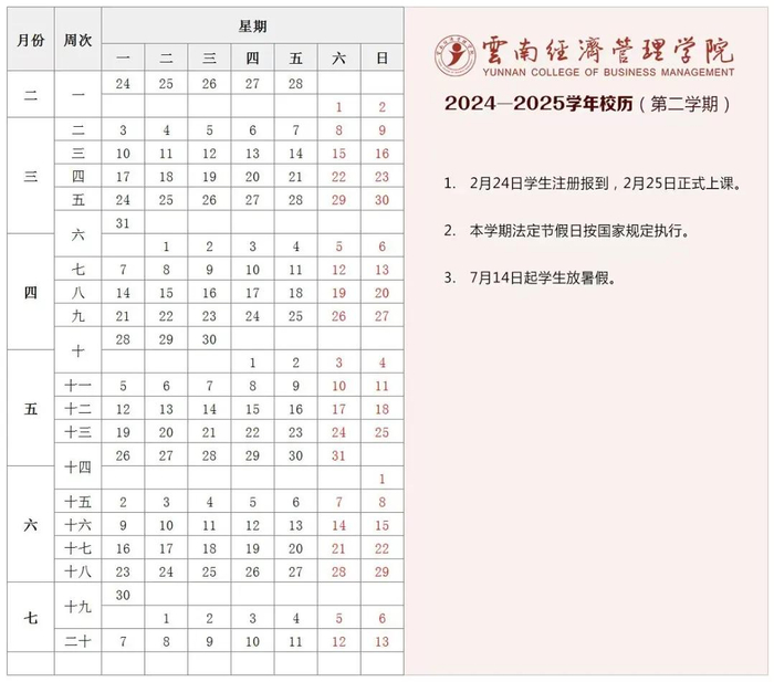 第二学期开学时间:2025年2月23日学生报到,2月24日上课。(教学时间为19周,含复习、考试时间)
