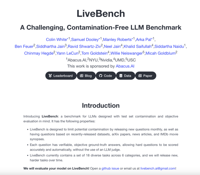 LiveBench是由AI科学家杨立昆(Yann LeCun)联合Abacus.AI、纽约大学等机构共同推出的评估平台。