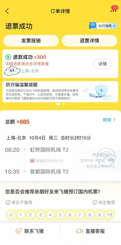 谁知一年后,“突然接到警察叔叔电话,说我涉嫌伪造病历骗取航司全额退款,我买了飞机(票)周六回老家配合取证。查了所有记录发现,飞猪平台扣了我的退票手续费,然后有人伪造了我的病历申请了全额赔付”。