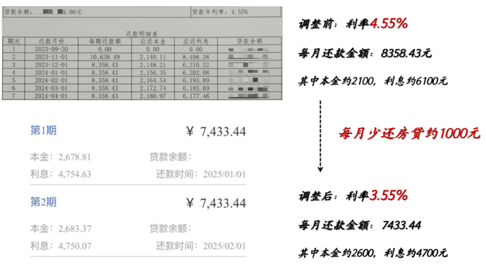 2023年每月房贷还是约8300元,如今只需支付约7400元,调整前和调整后,就是每月少还近1000元的房贷。