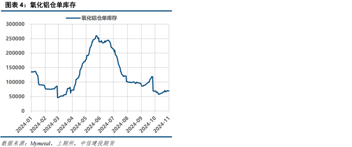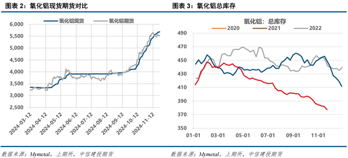 四季度供需矛盾更为凸显: ①今年云南枯水期电解铝厂未减产,西南地区需求较往年同期大幅增加。②新疆、贵州等地区电解铝有新增产能投产。③采暖季限产叠加北方铝厂的冬储采购需求:一方面采暖季对供应端的干扰持续存在。另一方面北方部分铝厂库存偏低(内蒙、青海、甘肃部分铝厂库存仅5-7天),总库存的持续下滑说明铝厂未能进行有效冬储。铝厂刚性采买需求支撑氧化铝现货价格持续走强。氧化铝期货价格持续上涨得到了现货价格的支撑,基差以现货上涨来收敛,夯实了氧化铝期货价格的下限。