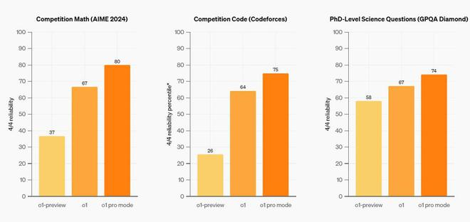 为了突出o1 pro mode的主要优势——可靠性更高,OpenAI还提高了评估门槛,要求只有在四次尝试中四次全部能够正确回答问题、而不是仅一次答对时,才能算作模型解决了问题。即使在这种高标准要求下,o1 pro mode的表现也明显强于o1 和 o1-preview。